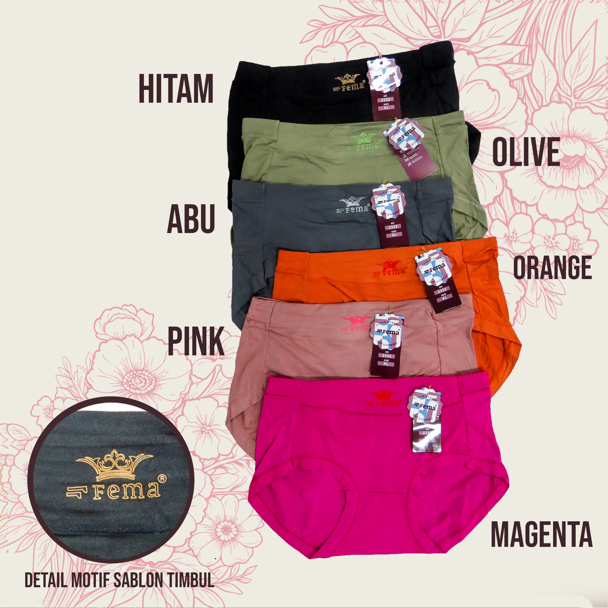 CELANA DALAM WANITA 2332 Motif : Polos Sablon FEMA Size L : 30 CM X 24 CM Size XL : 32 CM X 25 CM Size 3L : 34 CM X 27 CM